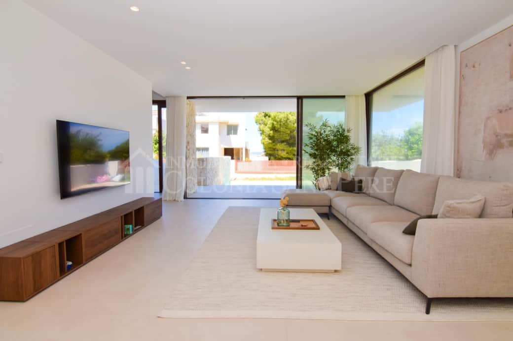 En accedir a l'habitatge, a mà esquerra ens rep un saló elegant amb grans finestrals de doble vidriera que permeten obrir completament l'espai, integrant l'interior amb la terrassa i la piscina.